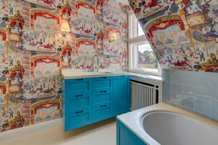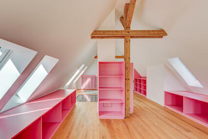 Eine natürliche, wiederhergestellte Raumabfolge, der Dachausbau, die Ausgestaltung der Innenräume und die Ausstattung mit neuem Kamin, extravaganten Leuchten und raffinierten Einbaumöbeln tragen eine ganz eigene Handschrift. Die Räumlichkeiten strahlen wieder in leuchtenden Farben und eine behagliche Wohnlichkeit macht sich nach einer technischen Instandsetzung vom Dach bis ins Untergeschoss breit.