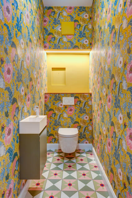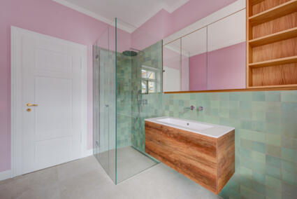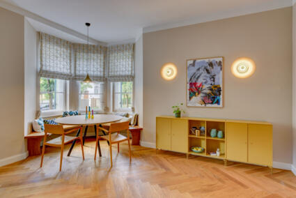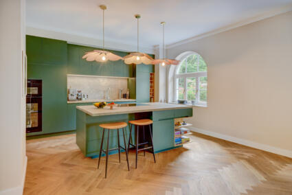 Ein ausgewogenes Farb- und Materialkonzept sowie der durchgehende Fischgrät-Holzboden aus Eichenstäben verleihen dem Haus eine warme, einladende Atmosphäre – Historie und Moderne bilden eine harmonische Symbiose.