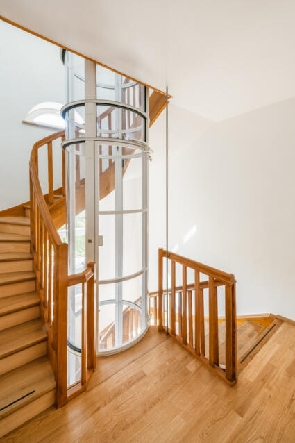 Im Treppenauge des Baudenkmals erfolgte der Einbau eines kleinen Aufzugs, der im Kontrast zur historischen Umgebung geradezu futuristisch erscheint. Zum Zeitpunkt des Einbaus ein Novum – der einzige Vakuum-Aufzug in München.