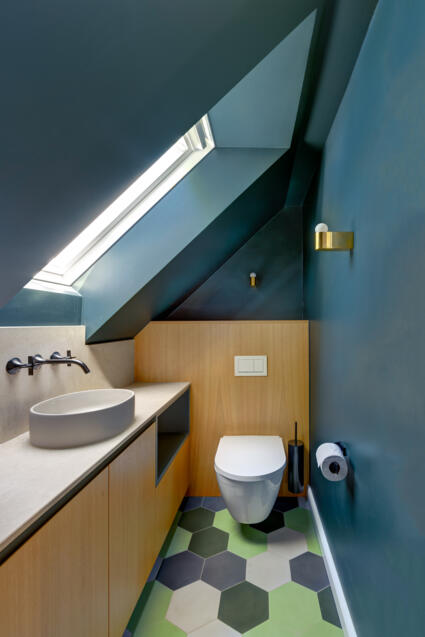 In Abstimmung mit der Denkmalschutzbehörde erhielt das Gebäude eine zurückhaltende Farbgebung, die den historischen Charme unterstreicht. Im Inneren wurde ein modernes Farbkonzept umgesetzt, das die traditionellen Elemente aufgreift und gleichzeitig moderne Akzente setzt. Die Holzarbeiten, einschließlich einer maßgefertigten Küche, wurden von einem renommierten Schreiner umgesetzt.