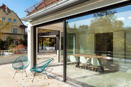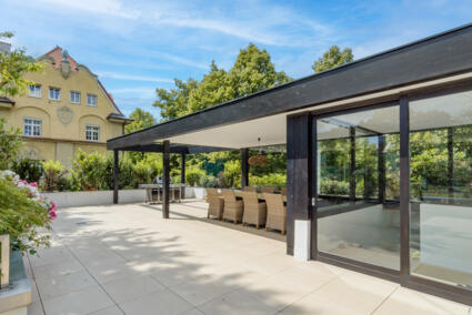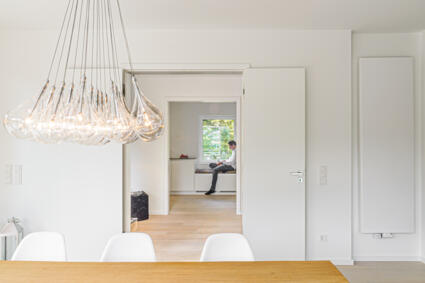 Durch die Sanierung und Umstrukturierung des Grundrisses entstanden in Verbindung mit dem offenen Wohn- und Essbereich völlig neue Perspektiven. Großformatige Hebeschiebetüren führen auf die weitläufige Terrasse mit Blick auf den Kanal und sorgen bei sommerlichen Temperaturen für ein mediterranes Wohngefühl. Das Farb- und Materialkonzept orientiert sich außen am Bestand, im Innenbereich unterstützen Eichenparkett, helle Wände und die matt-weißen Lackoberflächen der Einbaumöbel den lichtdurchfluteten Charakter.