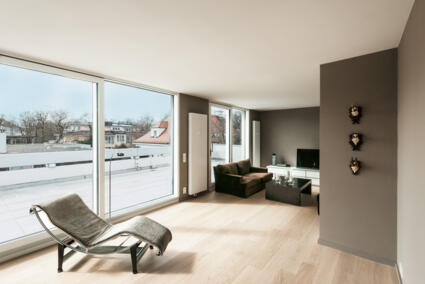 Die ehemals gefangene, dunkle Essplatz-Situation mit abgeschlossener Küche bekommt durch die Zusammenlegung der beiden Räume und einen Mauerdurchbruch zum Wohnzimmer eine entscheidende Aufwertung. Zusätzliches Tageslicht von der Südseite verwandelt die Wohnung effektvoll. Eine vierteilige Schiebetürenanlage schafft die größtmögliche Öffnung vom Wohn-Essbereich zur umlaufenden Dachterrasse. Mit einer besonderen Außenfliese belegt, bietet sich hier ein hochwertiger Außenraum.