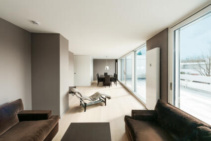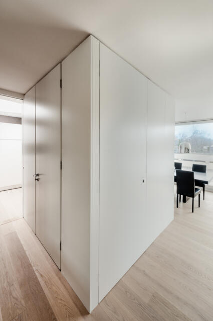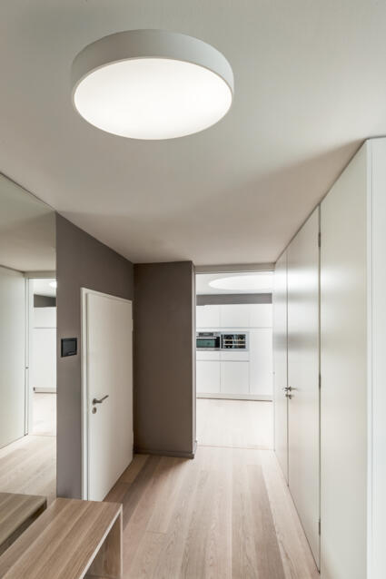 Der zentrale Aufzug wurde freigestellt und als weiß verkleideter Kubus inszeniert. Er ermöglicht den bequemen, direkten Zugang zur Wohnung. Zu den dunklen Mineralfarbtönen der umgebenden Wände bildet er einen schönen Kontrast. Gleichzeitig verschwinden in seiner Verkleidung die Schiebetüren, die bei Bedarf alle Funktionsbereiche der Wohnung voneinander abtrennen.
