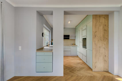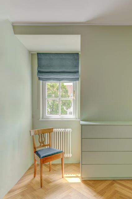 Bei der umfangreichen Kernsanierung des Erdgeschosses sowie des Dachspitzes wurden alte Bestandseinbauten behutsam aufgearbeitet und neue Fenster und Türen nach historischem Vorbild hergestellt, um die Authentizität des Hauses zu erhalten.