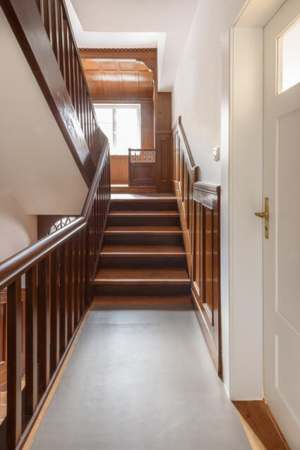 Die bestehenden Oberflächen von Holzverkleidungen, Fenstern, Türen sowie Bodenbelägen wurden soweit möglich sorgfältig aufgearbeitet oder entsprechend dem historischen Vorbild nachgebaut. Im Rahmen der Sanierung wurden alle Sanitär- und Elektroinstallationen erneuert, um neuesten technischen Standard zu gewährleisten. Durch das Tieferlegen der Bodenplatte im Gartengeschoss konnte mehr Raumhöhe gewonnen werden. So wichen niedrige Nebenräume einem großzügigen, repräsentativen Wohnraum, der ebenerdig an den Garten anschließt
